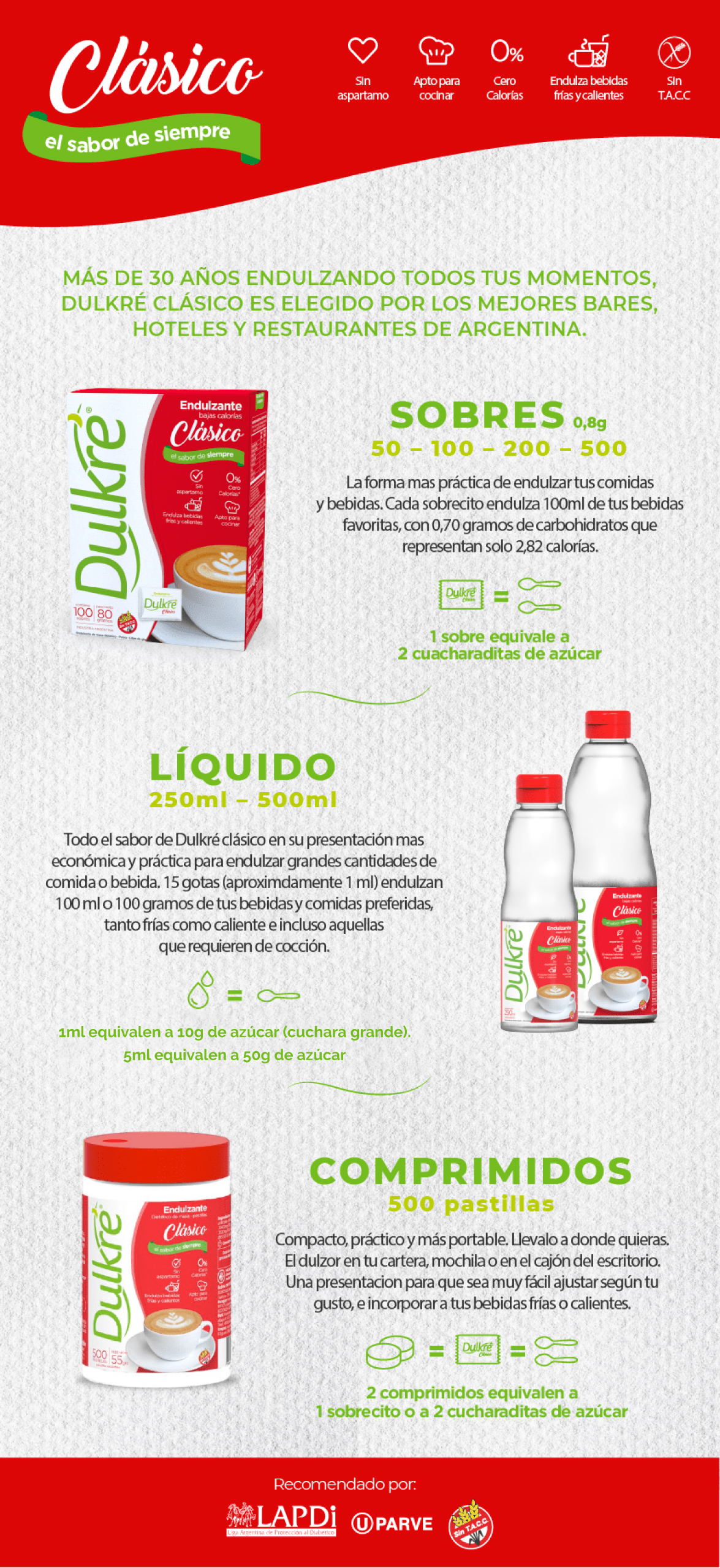 Dulkré Clásico en sobres es la forma más práctica y conveniente de endulzar tus bebidas y comidas. Cada sobrecito está diseñado para ofrecer el dulzor justo, siendo ideal para el consumo diario en el hogar, la oficina o para llevar.